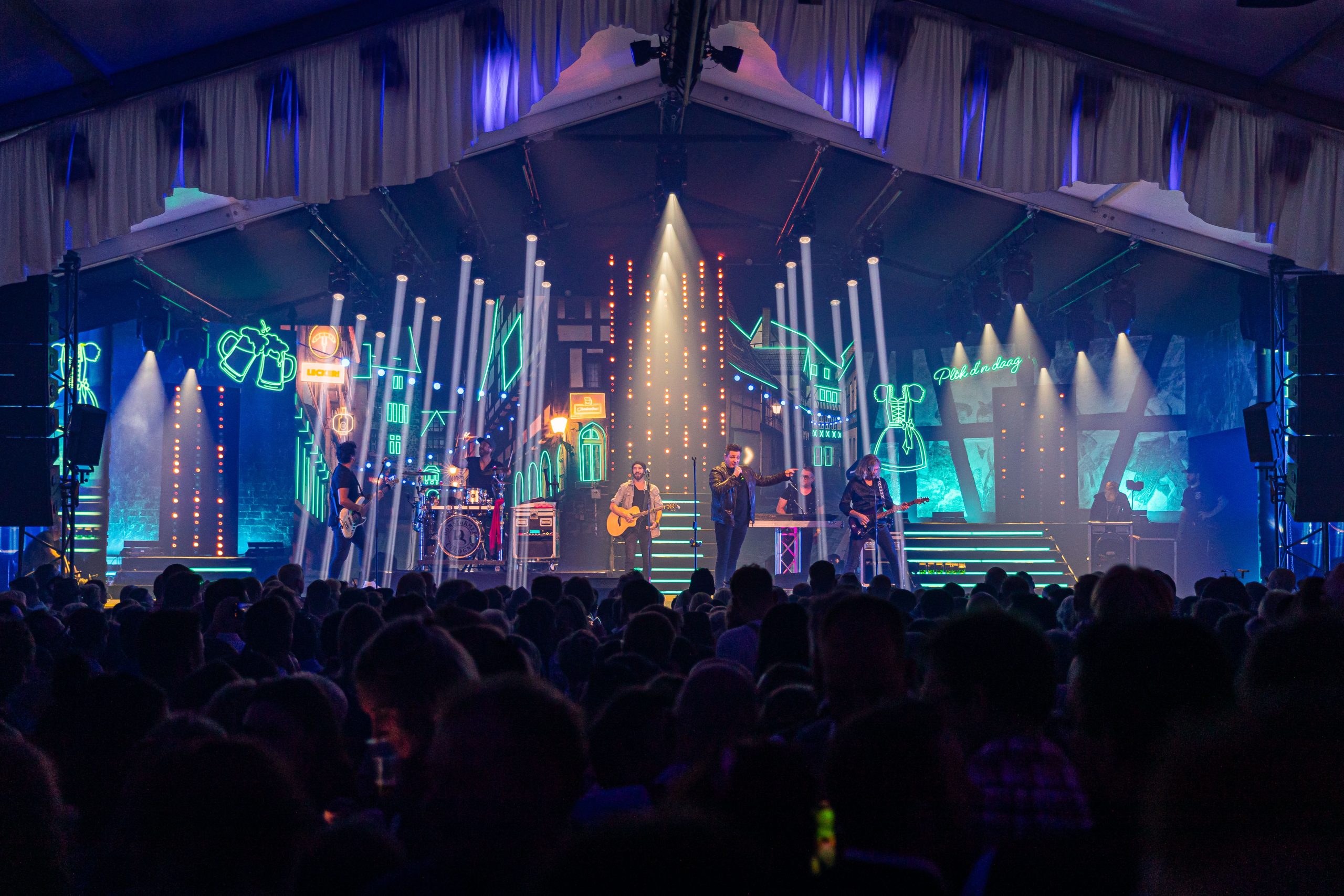 Trots dat wij dit jaar opnieuw het Brand Weizen Paviljoen volledig mochten voorzien van techniek! Van het eerste LED-effect tot de laatste noot uit de PA: we hebben álles uit de kast gehaald om het thema “Wir tanzen das Leben” technisch tot leven te brengen. In het paviljoen zorgden onze grote LED-schermen voor een kleurrijke, dynamische achtergrond die perfect inspeelde op de optredens en het publiek. We integreerden timecode-gestuurde lichtshows, slimme DMX-aansturing en video content die synchroon liep met het podiumprogrammaallemaal op maat afgestemd op acts als Kasalla, Brings, en Domstürmer. Onze geluidsinstallatie was geoptimaliseerd voor de akoestiek van de tent en het energieke karakter van het programma — van meezingers tot stevige feestknallers. Daarnaast verzorgden we de rigging, bekabeling en ondersteuning achter de schermen, zodat elke show technisch vlekkeloos kon draaien. Ook de gratis middagprogramma’s zoals Rimpelpop en de Schützen Sonntag profiteerden van dezelfde technische kwaliteit: strak geluid, sfeervol licht en LEDvisuals die de beleving compleet maakten. Dank aan het team, de organisatie en alle vrijwilligers voor de samenwerking. Het Brand Weizen Paviljoen stond als een huis en wij kijken nu al uit naar Oktoberfeesten 2025!